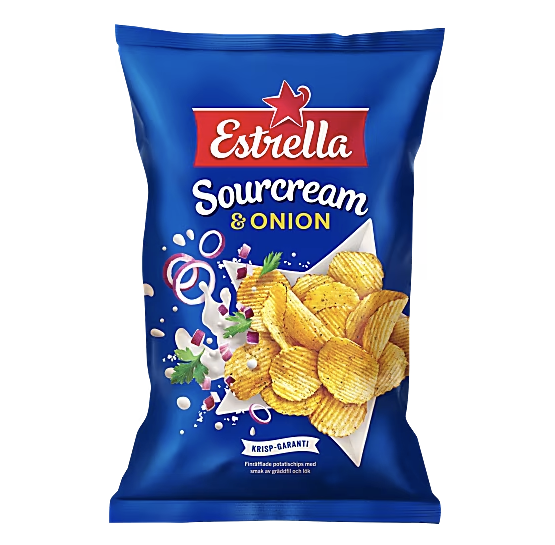 Estrella Sourcream & Onion är krispiga finräfflade potatischips med smak av gräddfil och lök. Sveriges mest populära chips och en riktig klassiker. Smaken är syrligt krämig med ett sting av lök som passar perfekt på snacks. Goda precis som de är eller med dipp. Direkt från chipsfabriken i Göteborg till alla filmkvällar, fester och andra krispiga stunder. Krispig helg!